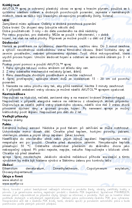 AKUTOL™ sprej je ochranný plastický obvaz ve spreji s hnacím plynem, používá se k rychlému ošetření oděrek a drobných povrchových poranění, zejména v namáhaných místech, která se těžko kryjí klasickými obvazovými prostředky (lokty, kolena)