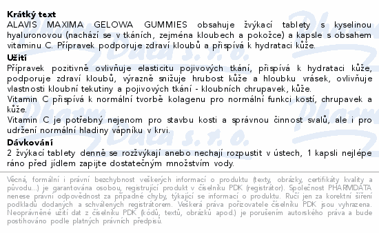 ALAVIS MAXIMA GELOWA GUMMIES obsahuje žvýkací tablety s kyselinou hyaluronovou (nachází se v tkáních, zejména kloubech a pokožce) a kapsle s obsahem vitaminu C. Přípravek podporuje zdraví kloubů a přispívá k hydrataci kůže.