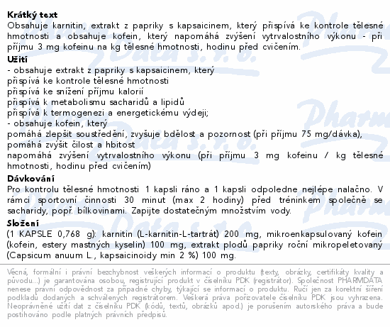 Obsahuje karnitin, extrakt z papriky s kapsaicinem, který přispívá ke kontrole tělesné hmotnosti a obsahuje kofein, který napomáhá zvýšení vytrvalostního výkonu - při příjmu 3 mg kofeinu na kg tělesné hmotnosti, hodinu před cvičením.