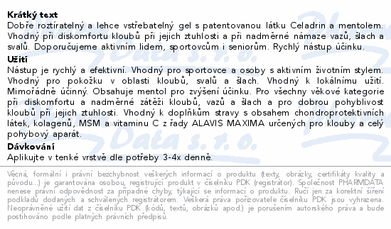 Dobře roztíratelný a lehce vstřebatelný gel s patentovanou látku Celadrin a mentolem. Vhodný při diskomfortu kloubů při jejich ztuhlosti a při nadměrné námaze vazů, šlach a svalů. Doporučujeme aktivním lidem, sportovcům i seniorům. Rychlý nástup účinku.