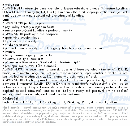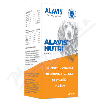 ALAVIS NUTRI obsahuje panenský olej z lososa (obsahuje omega 3 mastné kyseliny, EPA a DHA) s vitaminy (A, D3, E a H) a minerály (Se a Zi). Zlepšuje kvalitu srsti, její lesk a má pozitivní vliv na zlepšení celkové zdravotní kondice.