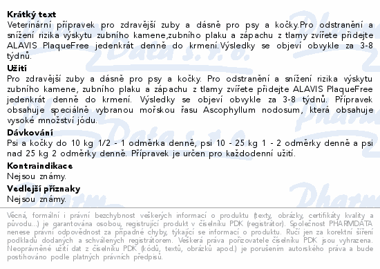 Veterinární přípravek pro zdravější zuby a dásně pro psy a kočky.Pro odstranění a snížení rizika výskytu zubního kamene,zubního plaku a zápachu z tlamy zvířete přidejte ALAVIS PlaqueFree jedenkrát denně do krmení.Výsledky se objeví obvykle za 3-8 týdnů.