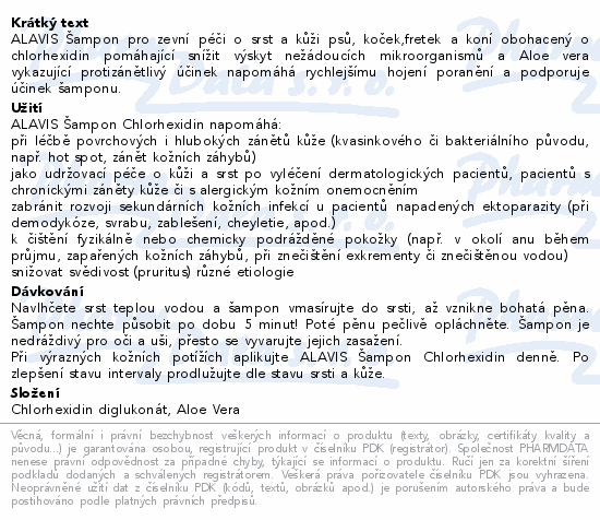 ALAVIS Šampon pro zevní péči o srst a kůži psů, koček,fretek a koní obohacený o chlorhexidin pomáhající snížit výskyt nežádoucích mikroorganismů a Aloe vera vykazující protizánětlivý účinek napomáhá rychlejšímu hojení poranění a podporuje účinek šamponu.