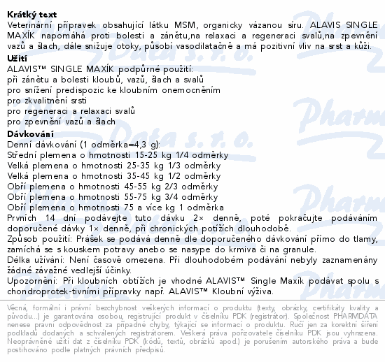 Veterinární přípravek obsahující látku MSM, organicky vázanou síru. ALAVIS SINGLE MAXÍK napomáhá proti bolesti a zánětu,na relaxaci a regeneraci svalů,na zpevnění vazů a šlach, dále snižuje otoky, působí vasodilatačně a má pozitivní vliv na srst a kůži.