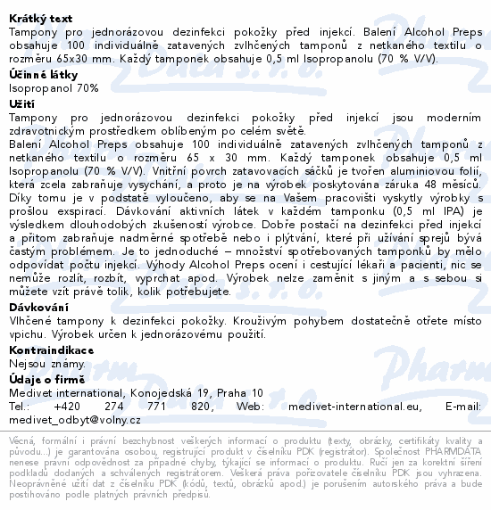 Tampony pro jednorázovou dezinfekci pokožky před injekcí. Balení Alcohol Preps obsahuje 100 individuálně zatavených zvlhčených tamponů z netkaného textilu o rozměru 65x30 mm. Každý tamponek obsahuje 0,5 ml Isopropanolu (70 % V/V).