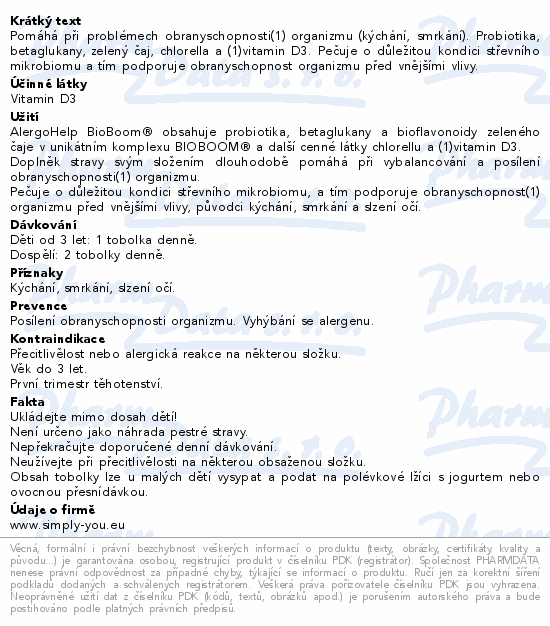 Pomáhá při problémech obranyschopnosti(1) organizmu (kýchání, smrkání). Probiotika, betaglukany, zelený čaj, chlorella a (1)vitamin D3. Pečuje o důležitou kondici střevního mikrobiomu a tím podporuje obranyschopnost organizmu před vnějšími vlivy.