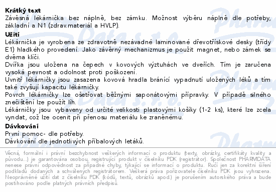 Závěsná lékárnička bez náplně, bez zámku. Možnost výběru náplně dle potřeby, základní a N1 (zdrav.materiál a HVLP).