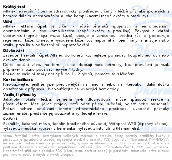 Alfalex je rektální čípek je zdravotnický prostředek určený k léčbě příznaků spojených s hemoroidálním onemocněním a jeho komplikacemi (např. ekzém a praskliny).