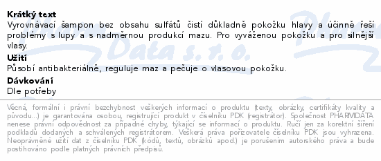 Vyrovnávací šampon bez obsahu sulfátů čistí důkladně pokožku hlavy a účinně řeší problémy s lupy a s nadměrnou produkcí mazu. Pro vyváženou pokožku a pro silnější vlasy.