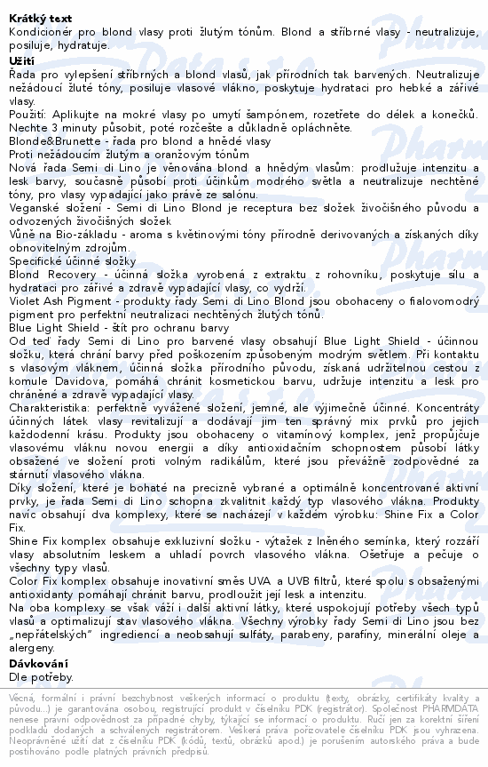 Kondicionér pro blond vlasy proti žlutým tónům. Blond a stříbrné vlasy - neutralizuje, posiluje, hydratuje.
