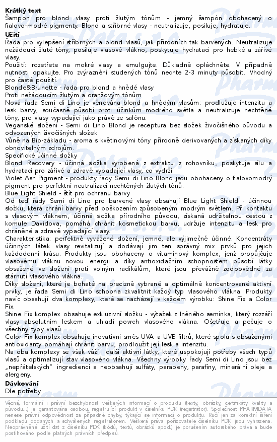 Šampon pro blond vlasy proti žlutým tónům - jemný šampón obohacený o fialovo-modré pigmenty. Blond a stříbrné vlasy - neutralizuje, posiluje, hydratuje.