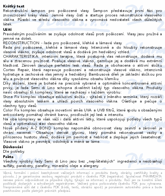 Rekonstrukční šampon pro poškozené vlasy. Šampon představuje první fázi pro znovuzrození krásy vlasů. Jemně vlasy čistí a startuje proces rekonstrukce vlasového vlákna. Působí ve středu vlasového vlákna a vyrovnává nedostatek všech důležitých látek.