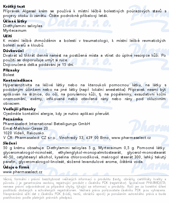 Algesal je lokální analgetikum a antirevmatikum obsahující kombinaci účinných látek, které odlišnými způsoby urychlují procesy hojení. Salicylát působí proti bolesti, protizánětlivě a zmírňuje otok. Myrtekain snižuje svalové napětí a působí místní znecitlivění.