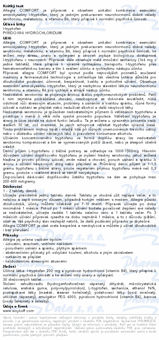 Allegra COMFORT je přípravek s obsahem unikátní kombinace esenciální aminokyseliny l-tryptofan, který je jediným prekursorem neurohormonů dobré nálady serotoninu, melatoninu, a vitamínu B6, který přispívá k normální psychické činnosti.