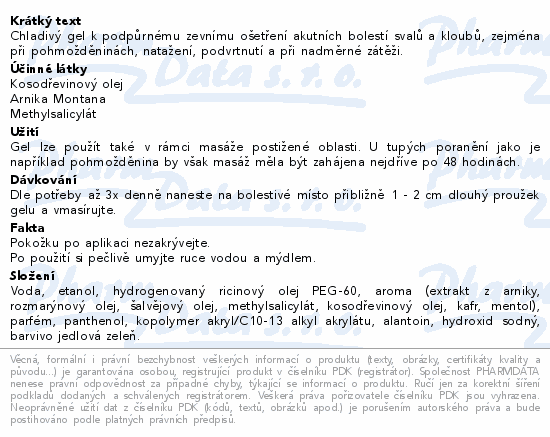 Chladivý gel k podpůrnému zevnímu ošetření akutních bolestí svalů a kloubů, zejména při pohmožděninách, natažení, podvrtnutí a při nadměrné zátěži.