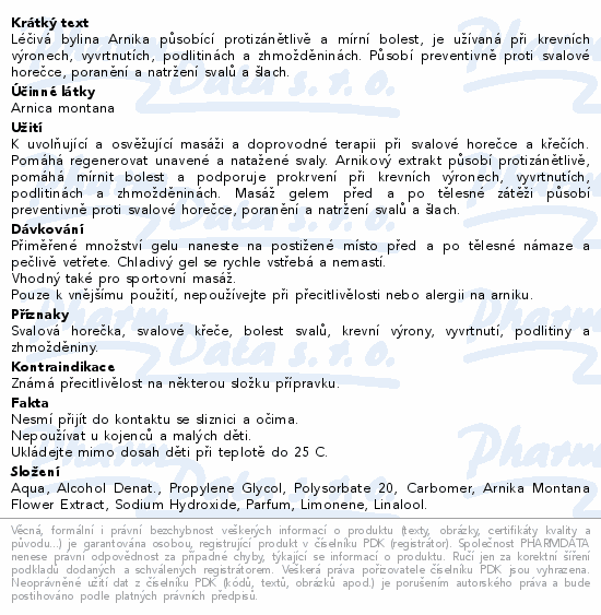 Léčivá bylina Arnika působící protizánětlivě a mírní bolest, je užívaná při krevních výronech, vyvrtnutích, podlitinách a zhmožděninách. Působí preventivně proti svalové horečce, poranění a natržení svalů a šlach.
