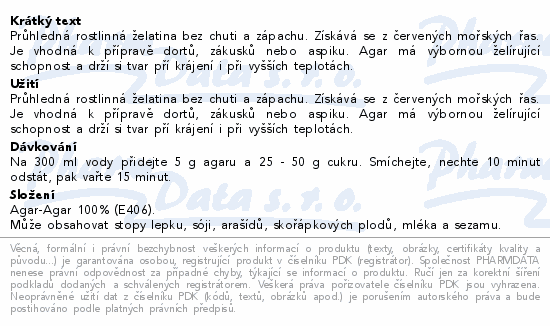 Průhledná rostlinná želatina bez chuti a zápachu. Získává se z červených mořských řas. Je vhodná k přípravě dortů, zákusků nebo aspiku. Agar má výbornou želírující schopnost a drží si tvar pří krájení i při vyšších teplotách.