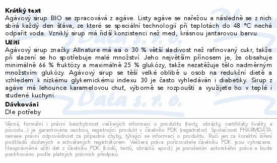 Allnature Agávový sirup BIO 250ml