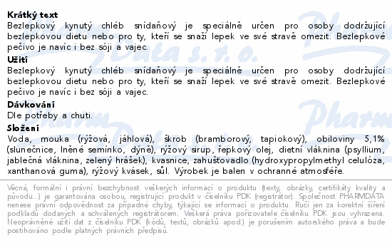 Bezlepkový kynutý chléb snídaňový je speciálně určen pro osoby dodržující bezlepkovou dietu nebo pro ty, kteří se snaží lepek ve své stravě omezit. Bezlepkové pečivo je navíc i bez sóji a vajec.
