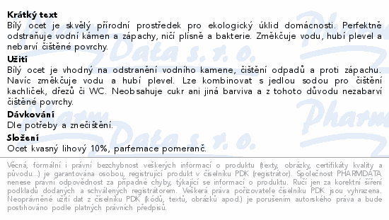 Bílý ocet je skvělý přírodní prostředek pro ekologický úklid domácnosti. Perfektně odstraňuje vodní kámen a zápachy, ničí plísně a bakterie. Změkčuje vodu, hubí plevel a nebarví čištěné povrchy.
