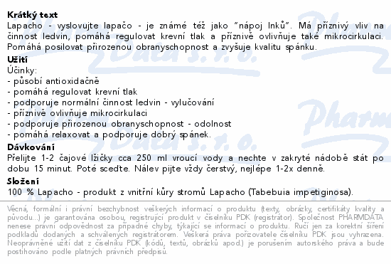 Lapacho - vyslovujte lapačo - je známé též jako “nápoj Inků”. Má příznivý vliv na činnost ledvin, pomáhá regulovat krevní tlak a příznivě ovlivňuje také mikrocirkulaci. Pomáhá posilovat přirozenou obranyschopnost a zvyšuje kvalitu spánku.