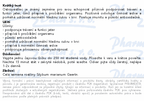Ostropestřec je známý zejména pro svou schopnost příznivě podporovat trávení a funkci jater, čímž přispívá k pročištění organismu. Pozitivně ovlivňuje činnost srdce a pomáhá udržovat normální hladinu cukru v krvi. Posiluje imunitu a působí antioxidačně.