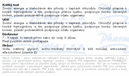 Životní energie a blahodárná síla přírody v kapkách chlorofylu. Chlorofyl přispívá k tvorbě hemoglobinu a tím podporuje přenos kyslíku, podporuje tvorbu červených krvinek, působí protizánětlivě podporuje očistu organismu.