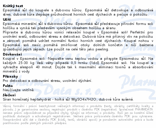 Epsomská sůl do koupele s dubovou kůrou. Epsomská sůl detoxikuje a odbourává stres, dubová kůra zlepšuje průchodnost horních cest dýchacích a pečuje o pokožku.