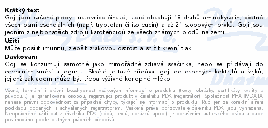 Goji jsou sušené plody kustovnice čínské, které obsahují 18 druhů aminokyselin, včetně všech osmi esenciálních (např. tryptofan či isoleucin) a až 21 stopových prvků. Goji jsou jedním z nejbohatších zdrojů karotenoidů ze všech známých plodů na zemi.