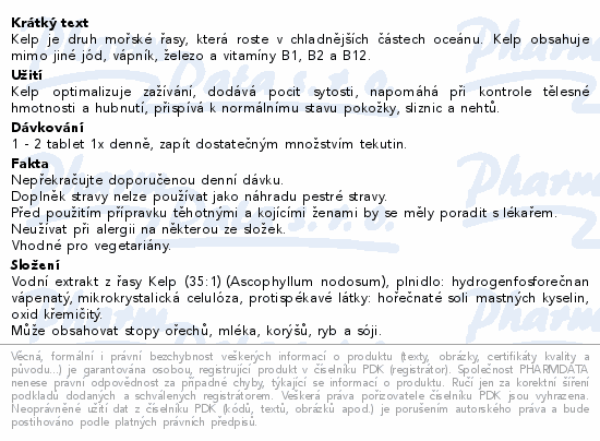 Kelp je druh mořské řasy, která roste v chladnějších částech oceánu. Kelp obsahuje mimo jiné jód, vápník, železo a vitamíny B1, B2 a B12.