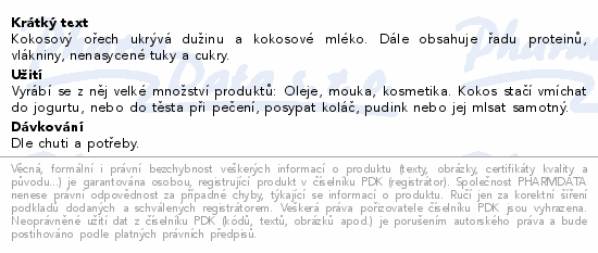 Kokosový ořech ukrývá dužinu a kokosové mléko. Dále obsahuje řadu proteinů, vlákniny, nenasycené tuky a cukry.