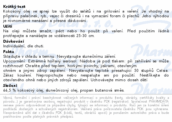 Kokosový olej ve spreji lze využít do salátů i na grilování a vaření. Je vhodný na přípravu palačinek, ryb, vajec či dresinků i na vymazání forem či plechů. Jeho výhodou je rovnoměrné nanášení a přesné dávkování.