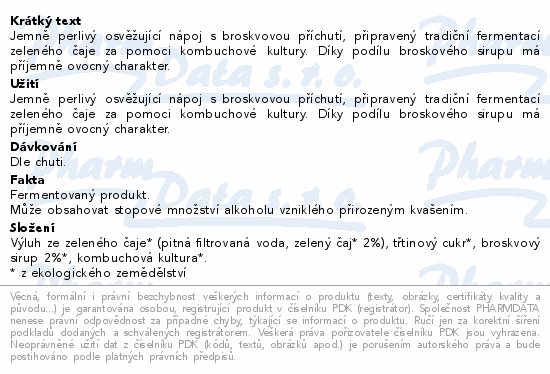 Jemně perlivý osvěžující nápoj s broskvovou příchutí, připravený tradiční fermentací zeleného čaje za pomoci kombuchové kultury. Díky podílu broskového sirupu má příjemně ovocný charakter.