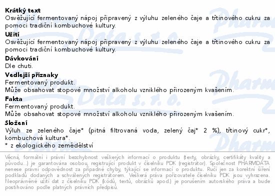 Osvěžující fermentovaný nápoj připravený z výluhu zeleného čaje a třtinového cukru za pomoci tradiční kombuchové kultury.