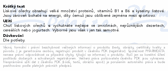 Lískové ořechy obsahují velké množství proteinů, vitamínů B1 a B6 a kyseliny listové. Jsou zároveň bohaté na energii, díky čemuž jsou oblíbené zejména mezi sportovci.