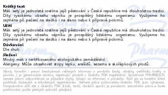 Mák setý je jednoletá rostlina jejíž pěstování v České republice má dlouholetou tradici. Díky vysokému obsahu vápníku je prospěšný lidskému organismu. Využijeme ho zejména při pečení na sladko i na slano nebo k přípravě pokrmů.