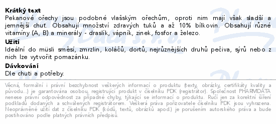 Pekanové ořechy jsou podobné vlašským ořechům, oproti nim mají však sladší a jemnější chuť. Obsahují množství zdravých tuků a až 10% bílkovin. Obsahují různé vitamíny (A, B) a minerály - draslík, vápník, zinek, fosfor a železo.
