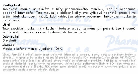 Tapioková mouka se získává z hlízy jihoamerického manioku, což je okopanina podobná bramboře. Tato mouka je oblíbená díky své výživové hodnotě, proto ji ve svém jídelníčku ocení každý, kdo vyhledává zdravé potraviny. Tapioková mouka je bezlepková.