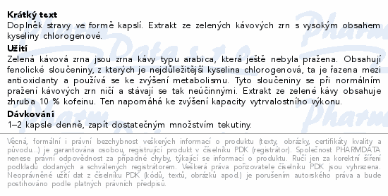 Doplněk stravy ve formě kapslí. Extrakt ze zelených kávových zrn s vysokým obsahem kyseliny chlorogenové.