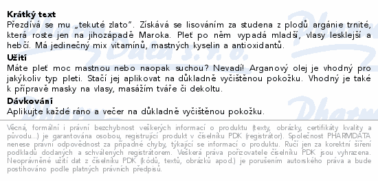 Přezdívá se mu „tekuté zlato“. Získává se lisováním za studena z plodů argánie trnité, která roste jen na jihozápadě Maroka. Pleť po něm vypadá mladší, vlasy lesklejší a hebčí. Má jedinečný mix vitamínů, mastných kyselin a antioxidantů.