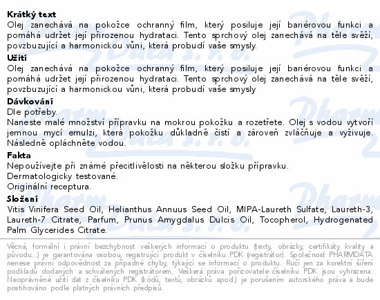 Olej zanechává na pokožce ochranný film, který posiluje její bariérovou funkci a pomáhá udržet její přirozenou hydrataci. Tento sprchový olej zanechává na těle svěží, povzbuzující a harmonickou vůni, která probudí vaše smysly.