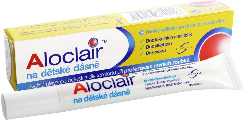 Aloclair na dětské dásně, bio-adhezivní orální gel,chrání dásně před bolestí a diskomfortem spojeným s prořezáváním prvních zubů, napomáhá úlevě od bolesti a zarudnutí. Aplikátor je opatřen silikonovými štětinkami, které jemně masírují dáseň.
