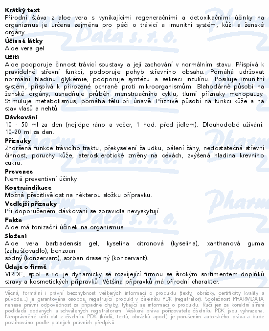 Přírodní šťáva z aloe vera s vynikajícími regeneračními a detoxikačními účinky na organizmus je určena zejména pro péči o trávicí a imunitní systém, kůži a ženské orgány.