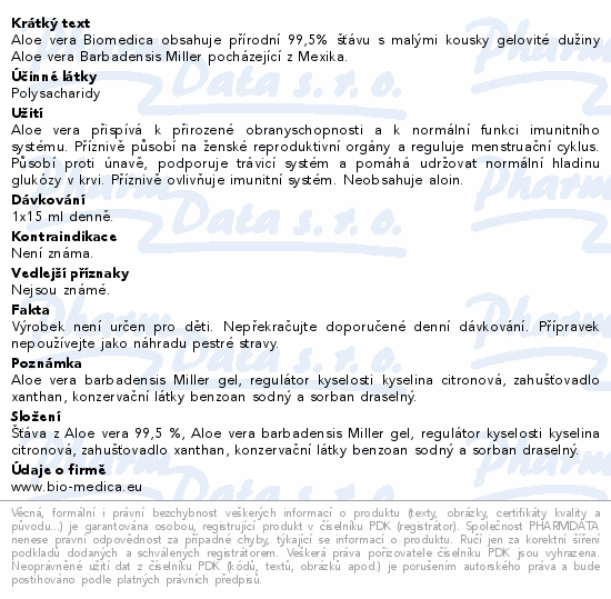 Aloe vera Biomedica obsahuje přírodní 99,5% šťávu s malými kousky gelovité dužiny Aloe vera Barbadensis Miller pocházející z Mexika.