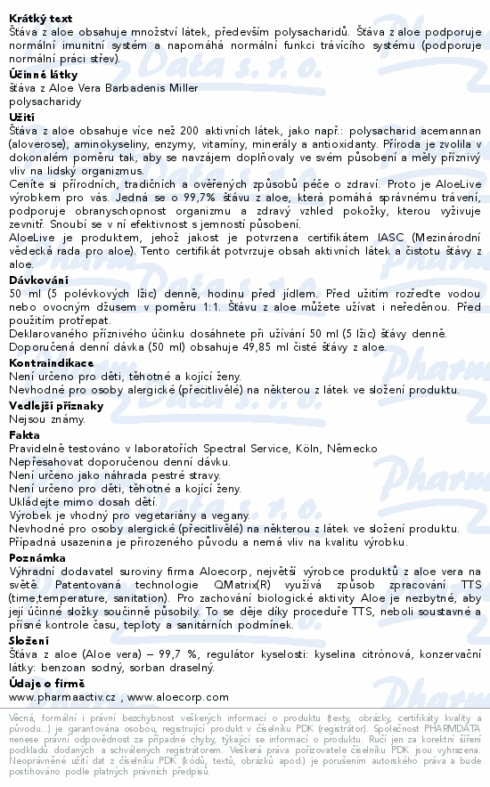 Šťáva z aloe obsahuje množství látek, především polysacharidů. Šťáva z aloe podporuje normální imunitní systém a napomáhá normální funkci trávícího systému (podporuje normální práci střev).