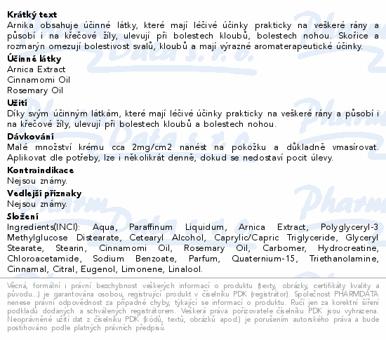 Arnika obsahuje účinné látky, které mají léčivé účinky prakticky na veškeré rány a působí i na křečové žíly, ulevují při bolestech kloubů, bolestech nohou. Skořice a rozmarýn omezují bolestivost svalů, kloubů a mají výrazné aromaterapeutické účinky.