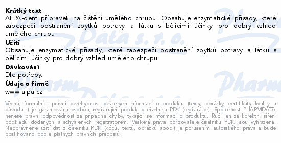 ALPA-dent přípravek na čištění umělého chrupu. Obsahuje enzymatické přísady, které zabezpečí odstranění zbytků potravy a látku s bělícími účinky pro dobrý vzhled umělého chrupu.