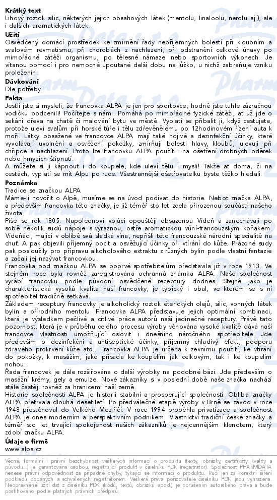 Kosmetický přípravek určený k zevnímu použití – na masáže pokožky těla, do koupele, po zředění vodou k obkladům. Lihový roztok přírodních rostlinných silic, některých jejich obsahových látek, ale i dalších aromatických látek.