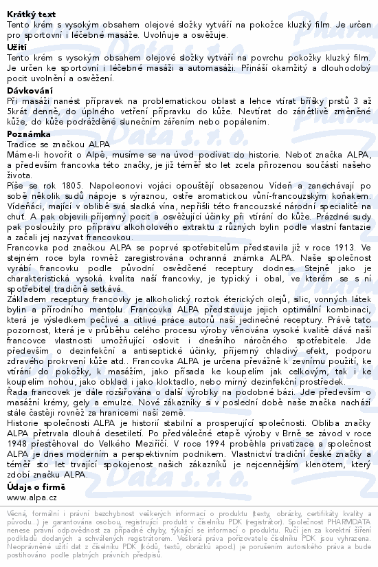 Tento krém s vysokým obsahem olejové složky vytváří na pokožce kluzký film. Je určen pro sportovní i léčebné masáže. Uvolňuje a osvěžuje.