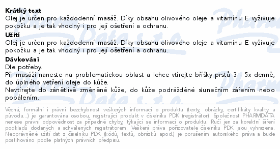 Olej je určen pro každodenní masáž. Díky obsahu olivového oleje a vitamínu E vyživuje pokožku a je tak vhodný i pro její ošetření a ochranu.
